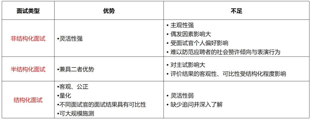 面试又分为非结构化面试、结构化面试和半结构化面试。它们的特点分别如下: