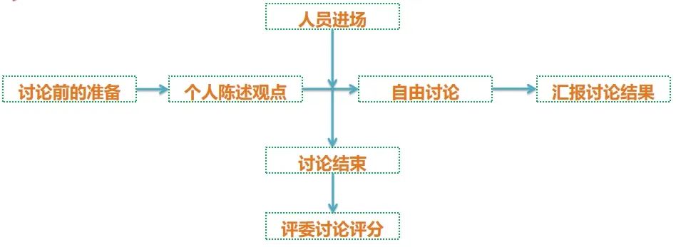 测评实施步骤。准备好实施场地后,分布开始实施,按照6-8人每组进行人员划分,兼顾性别与年龄,向被评价者分发纸、笔、题目等讨论工具,向评价者发放评价表、观察记录表等评价工具,讨论开始前介绍讨论主题背景资料、讨论步骤和讨论要求,然后正式开展讨论,讨论期间评价者不得参加任何提问、讨论或者回答被评价者与测评有关的任何问题,避免提醒被评价者。讨论实施流程如下: